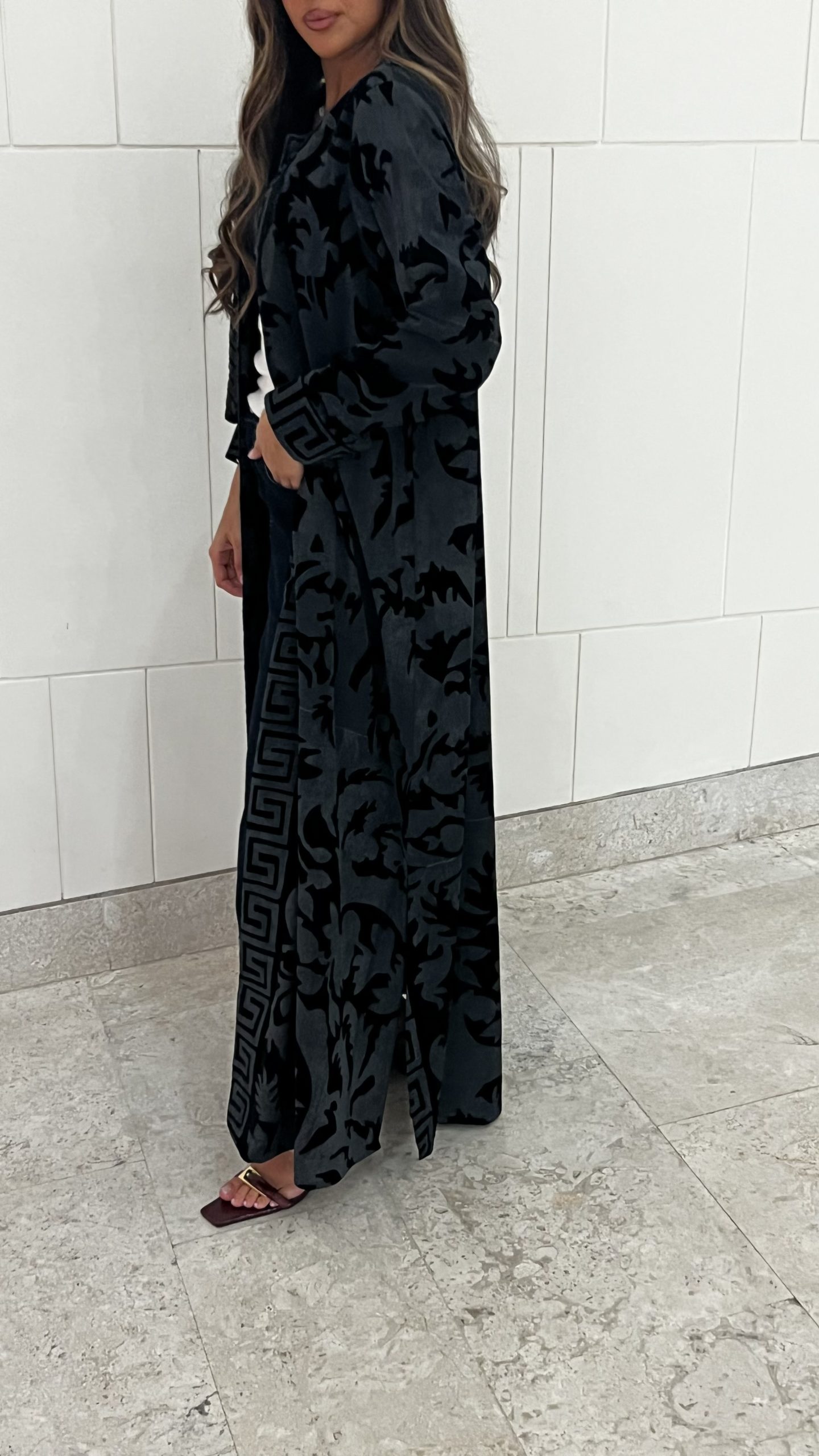 This statement abaya is crafted from a rich, velvet-effect fabric that exudes depth and sophistication. Designed in a deep black base, it features a striking contrasting central panel adorned with a bold geometric motif, framed by soft floral velvet patterns that add texture and visual richness without overpowering the silhouette.